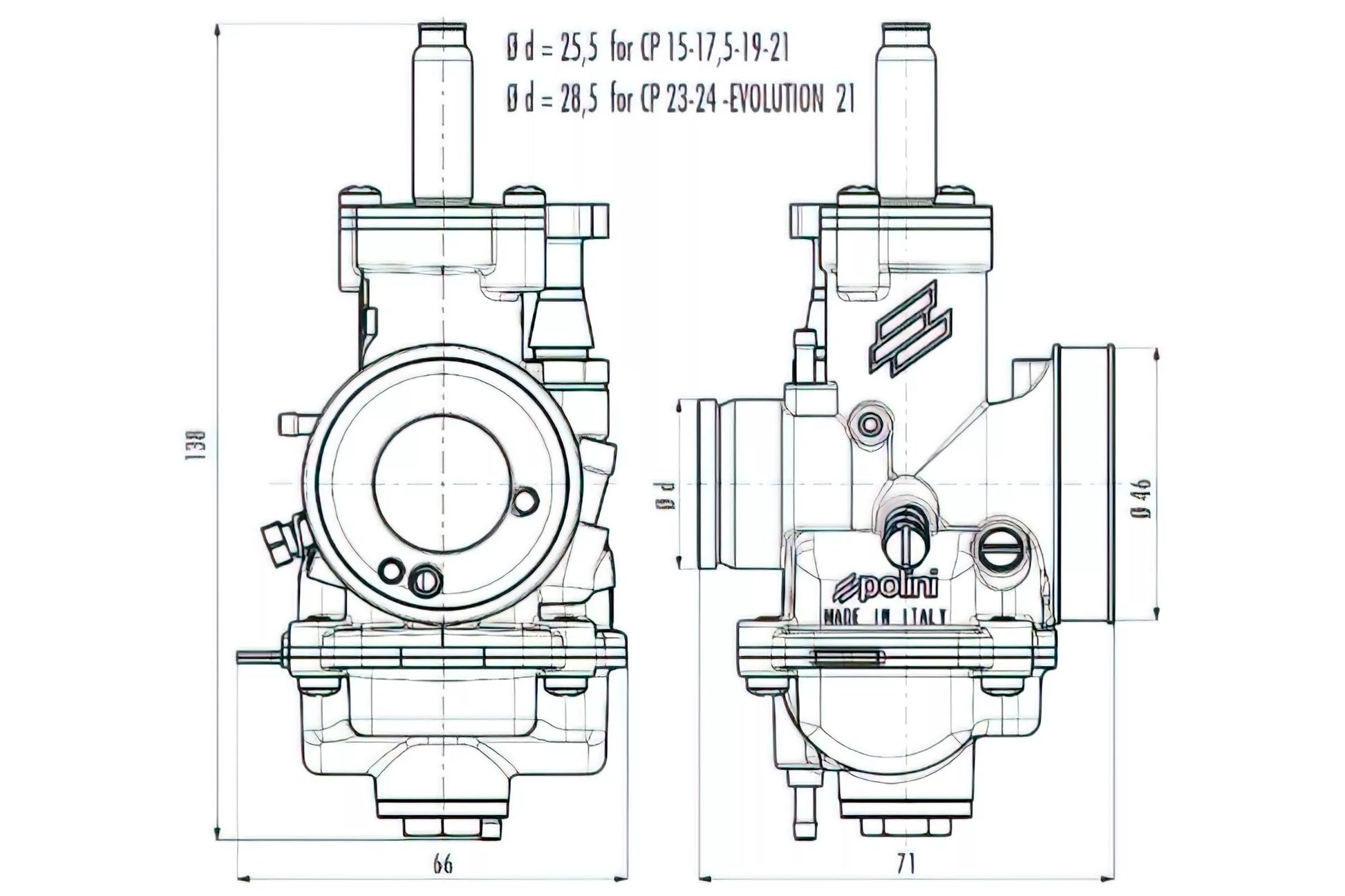 Polini CP är en italiensktillverkad högkvalitativ förgasare som kombinerar kompakt design, låg vikt och stark prestanda. Den är tillverkad helt i aluminium och väger cirka 40 % mindre än motsvarande förgasare från andra tillverkare.