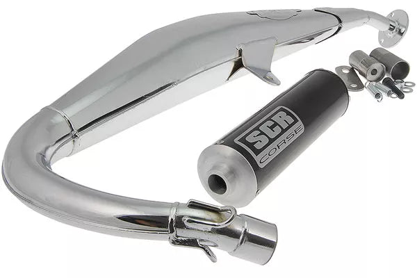 Vi erbjuder en av de mest eftertraktade sportavgasrören på marknaden! SCR Corse SM Chrome 50cc med svart ljuddämpare, lågmonterad version för AM6-motorer, till ett riktigt bra pris!