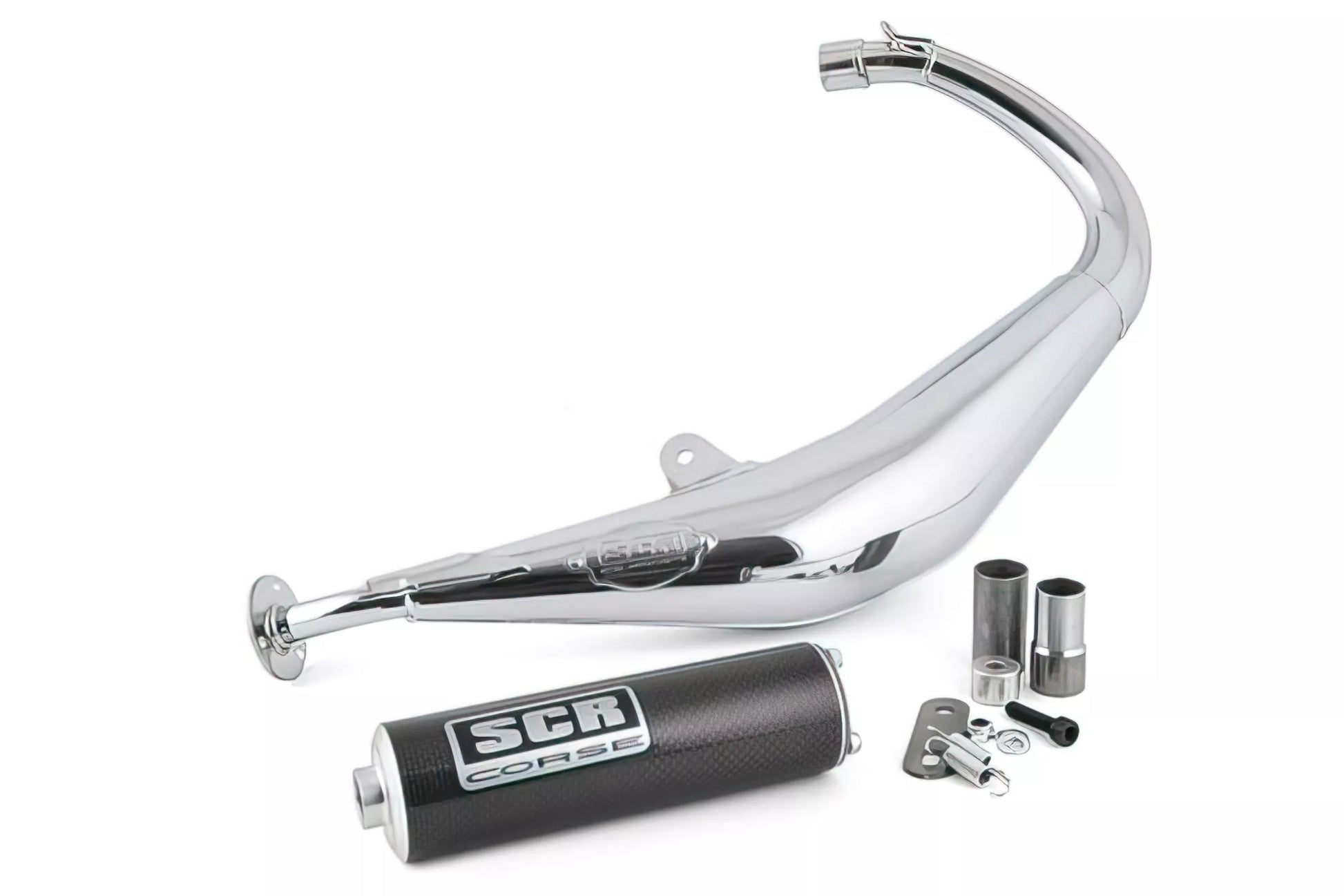 Vi erbjuder en av de mest eftertraktade sportavgasrören på marknaden! SCR Corse SM Chrome 50cc med kolfiberljuddämpare, lågmonterad version för AM6-motorer, till ett riktigt bra pris!