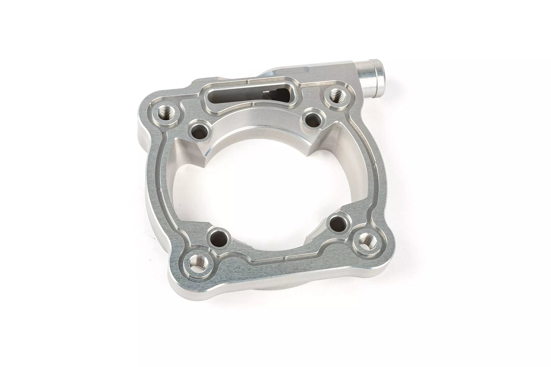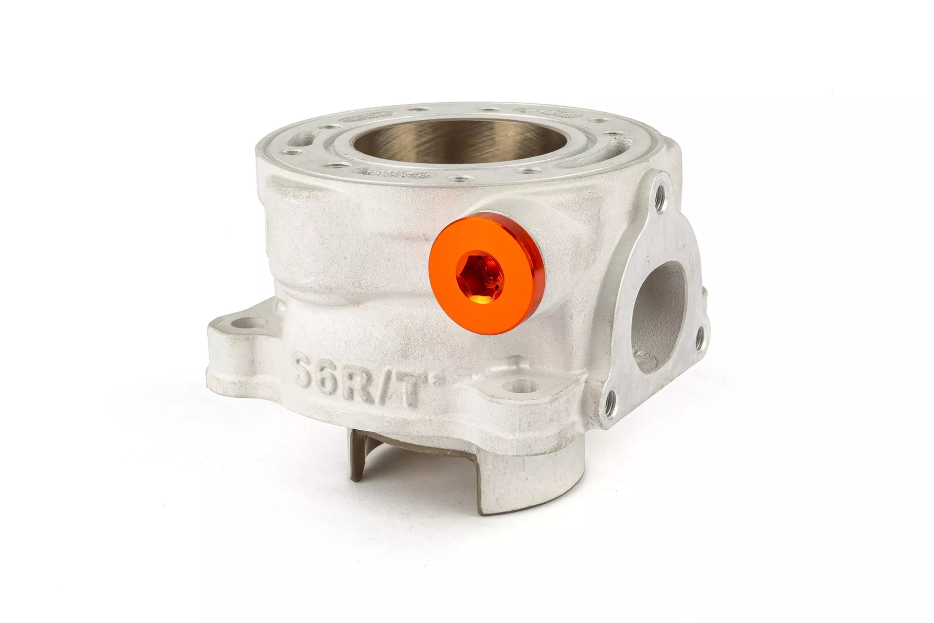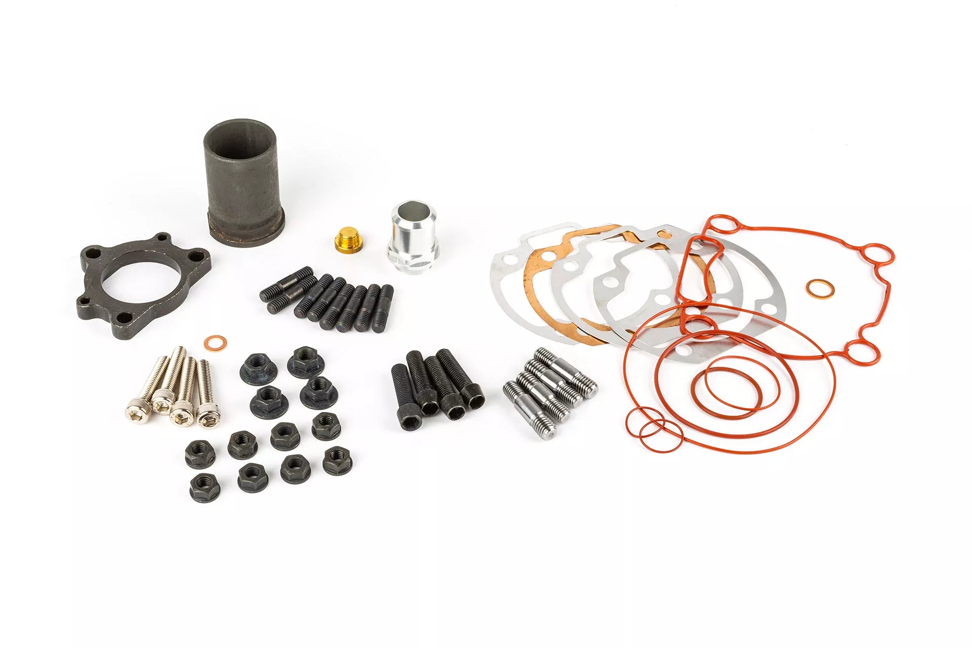 Adapterplatta skruvas fast i motorblocket, cylindern monteras sedan med externa bultar – inga bultar går genom cylindern, vilket ger mer frihet för portning och tuning.
