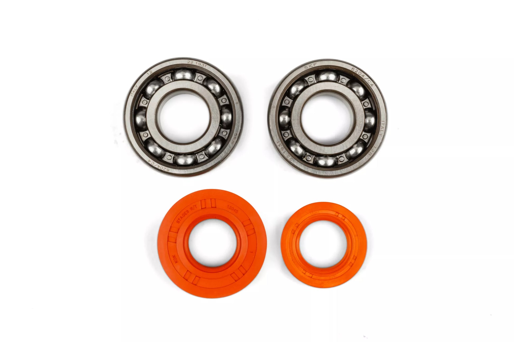 Stage6 R/T vevaxellagerkit med SKF-stålkorgslager och nya orangea FKM-packboxar, byggt för både prestanda och hållbarhet.