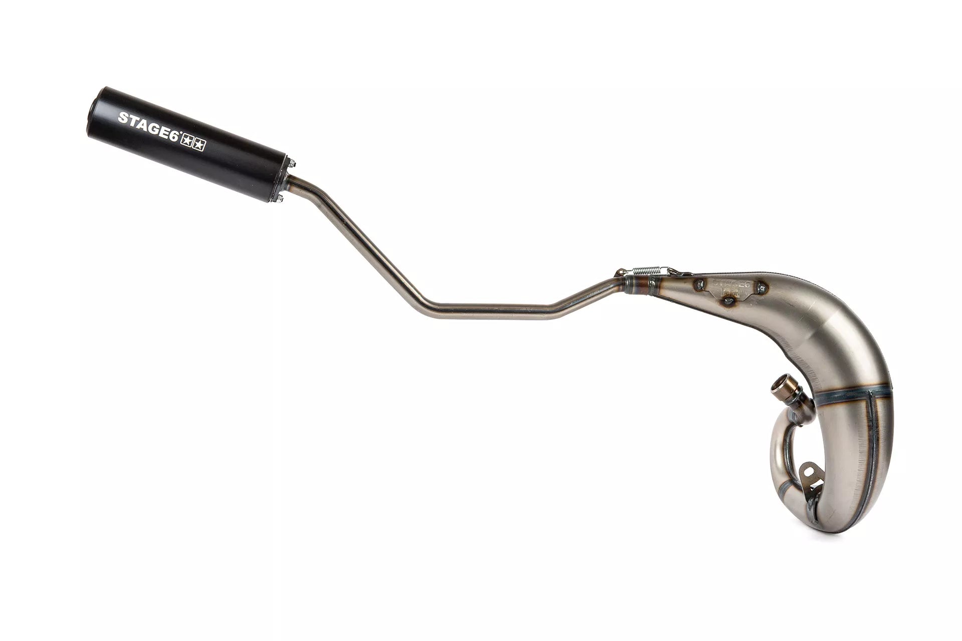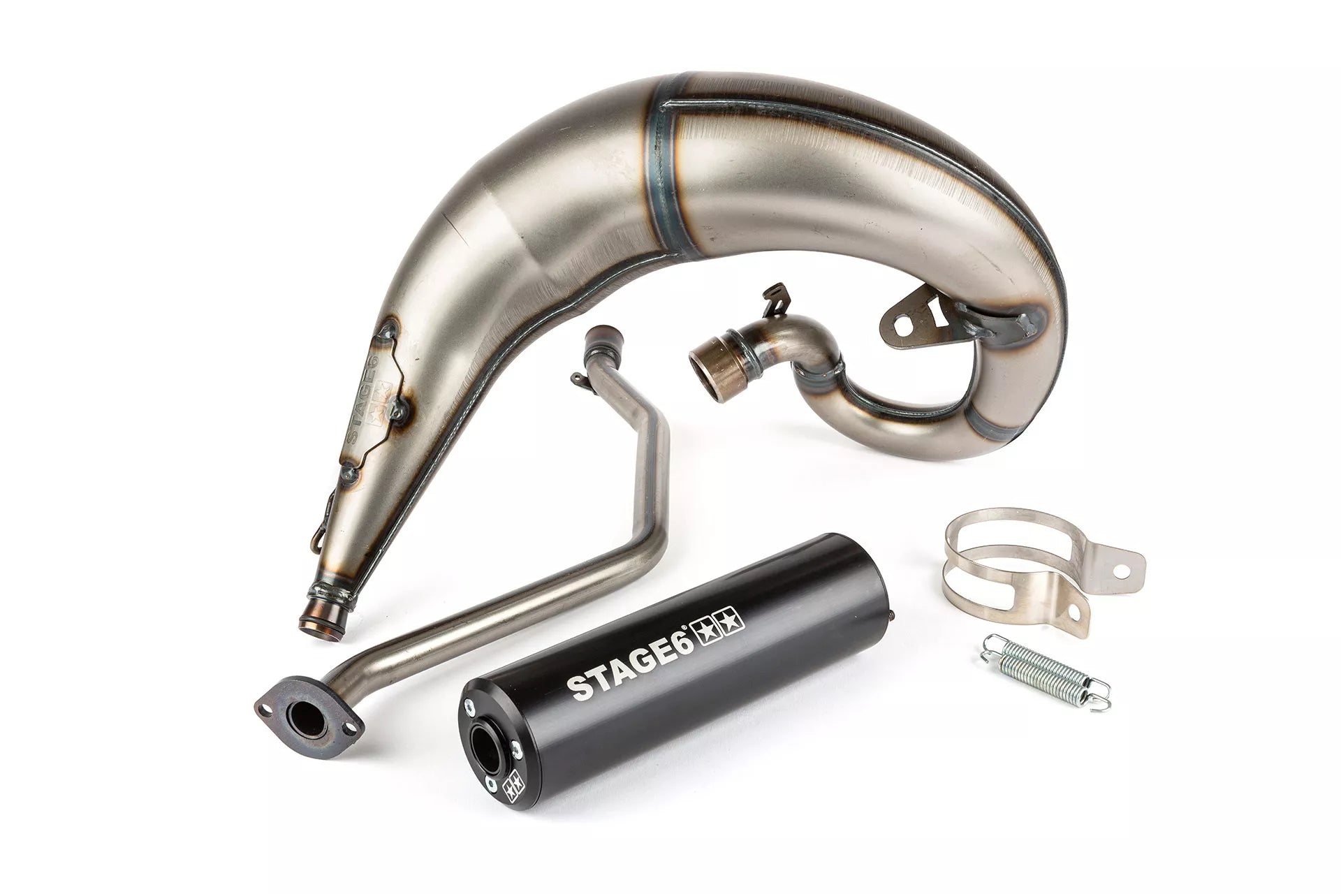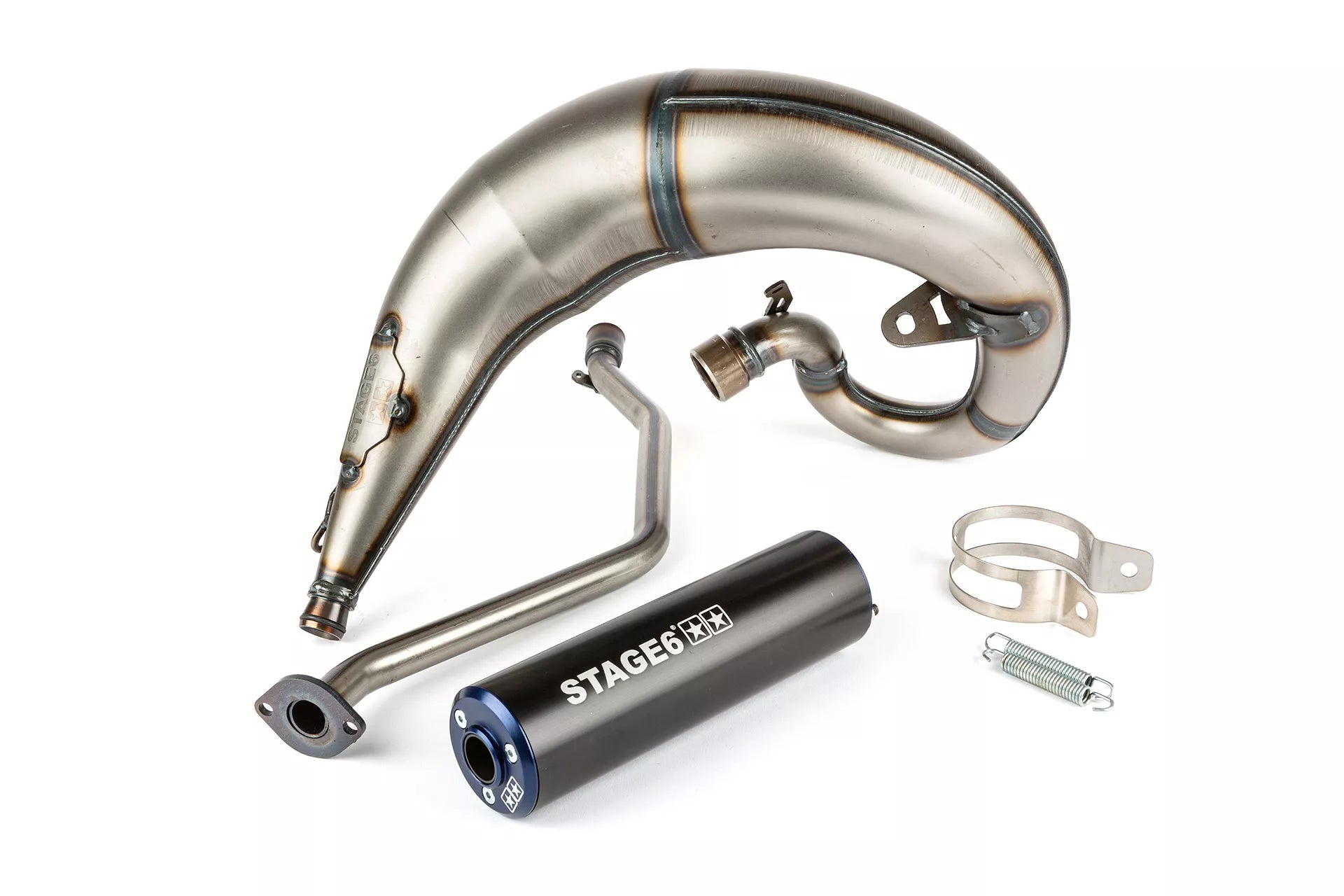 Högmonterat trimavgassystem från Stage6, utvecklat för deras populära Streetrace-cylindrar (50–77cc). Det här är ett mycket mångsidigt system som passar ett stort antal mopeder med Minarelli AM6-motor, till exempel Rieju MRT, Drac, Beta RR, Sherco SM/SE, Fantic och fler.
