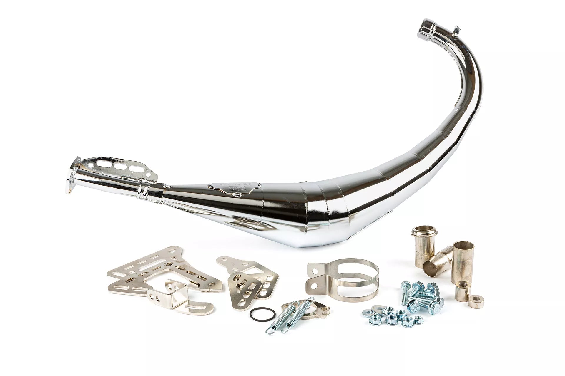 Tillverkad i tunnplåt och kromad, vilket ger både väderskydd och ett snyggt utseende. Monteringssats för Derbi/AM6 medföljer. Ljuddämparen i aluminium (50–80cc) är fylld med kvalitetsstålull för låg ljudnivå och godkänd ljudnivå på vägen.
