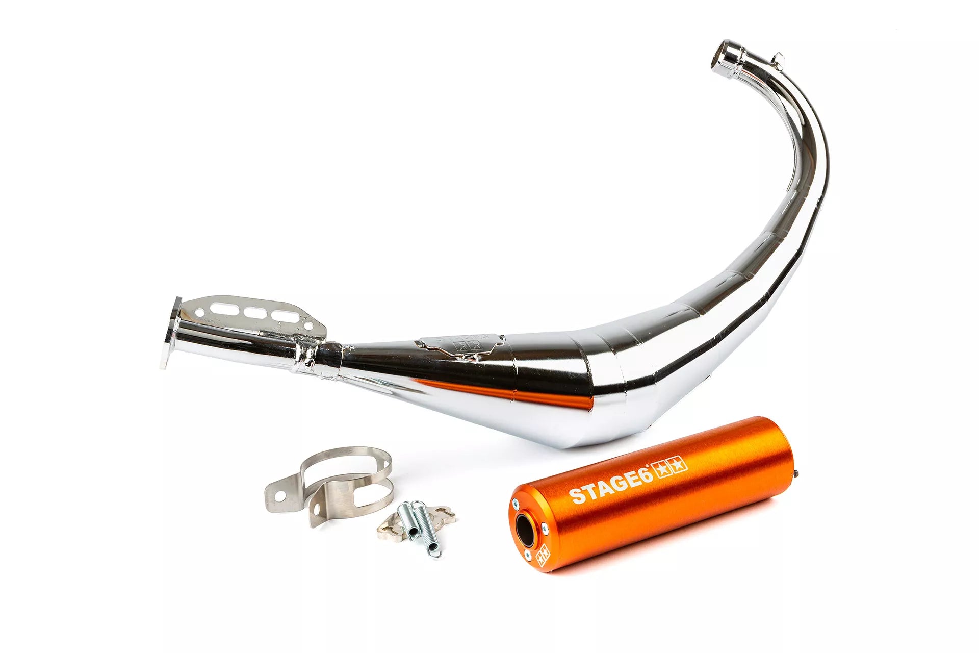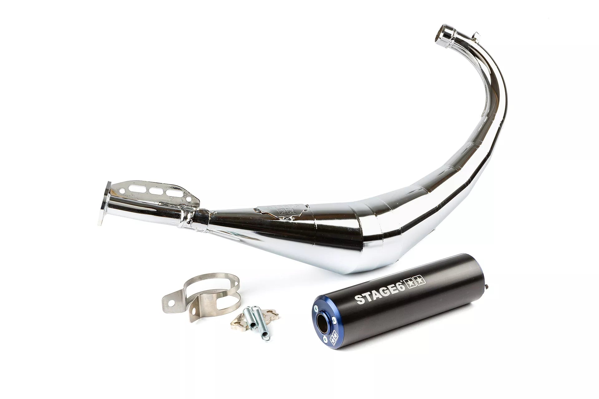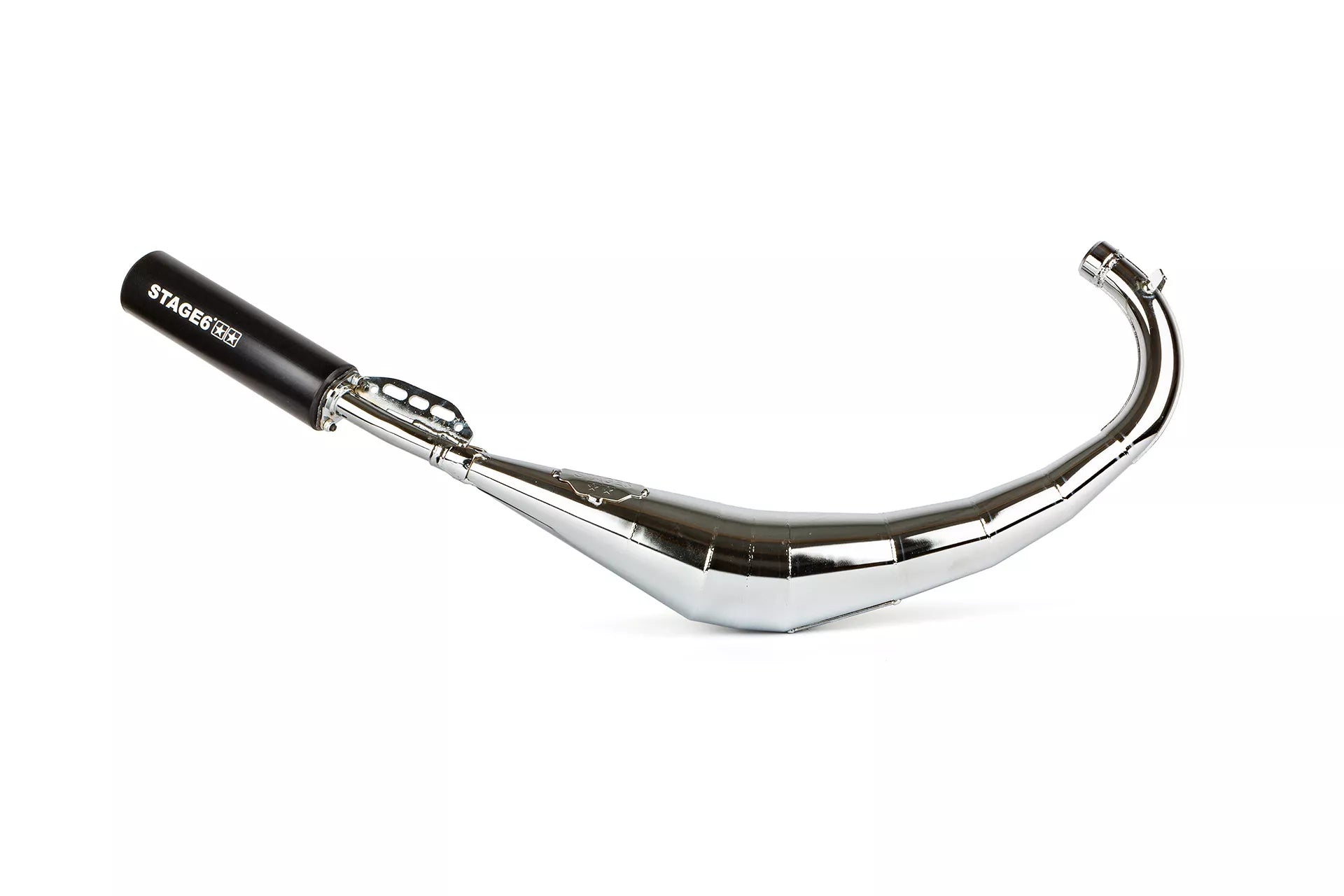 Stage6 Streetrace avgassystem är utvecklat speciellt för Stage6 Streetrace cylindrar (gjutjärn, 50–77cc) och erbjuder ett optimalt balans mellan väglegal prestanda, tillförlitlighet och prisvärdhet. Denna version är low mount, vilket innebär att avgasröret går lågt under motorn, en stilren lösning för dig som kör Derbi eller AM6.