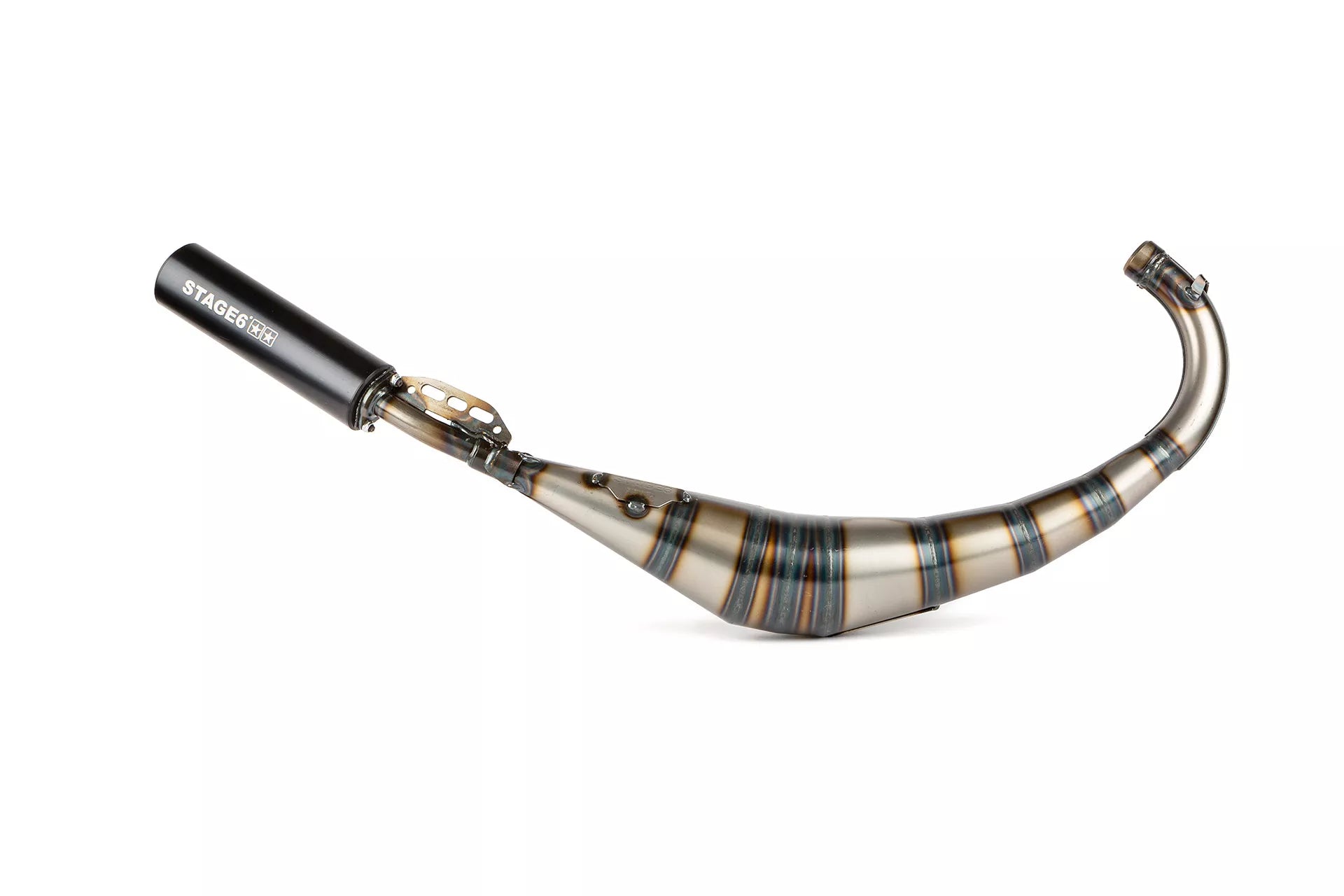 Stage6 Streetrace avgassystem är utvecklat speciellt för Stage6 Streetrace cylindrar (gjutjärn, 50–77cc) och erbjuder ett optimalt balans mellan väglegal prestanda, tillförlitlighet och prisvärdhet. Denna version är low mount, vilket innebär att avgasröret går lågt under motorn, en stilren lösning för dig som kör Derbi eller AM6.